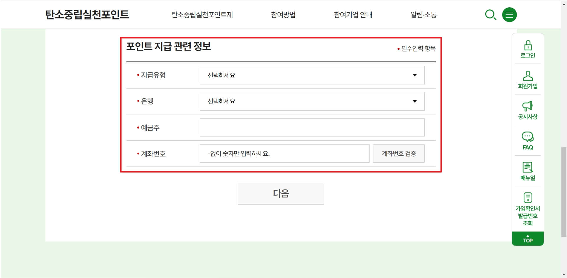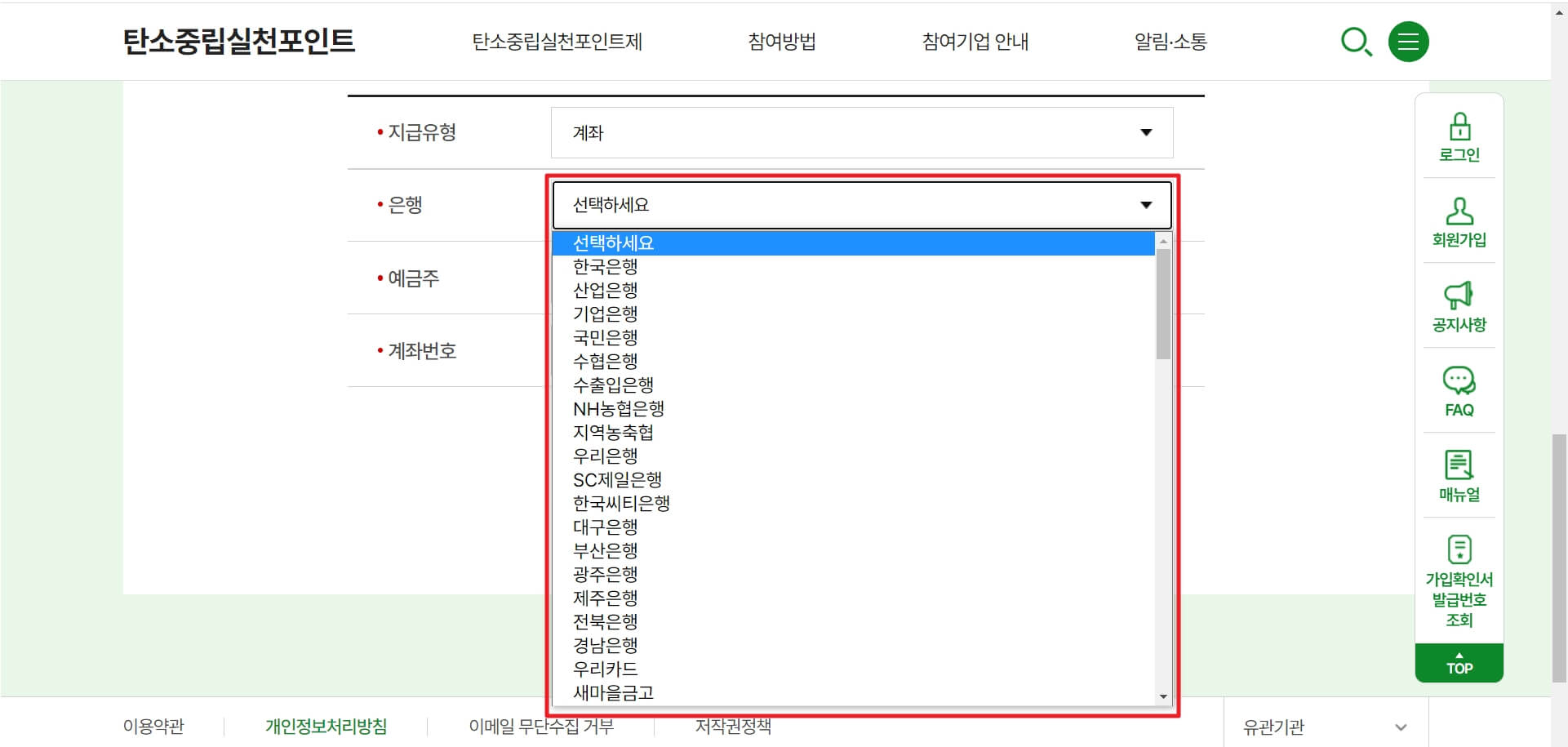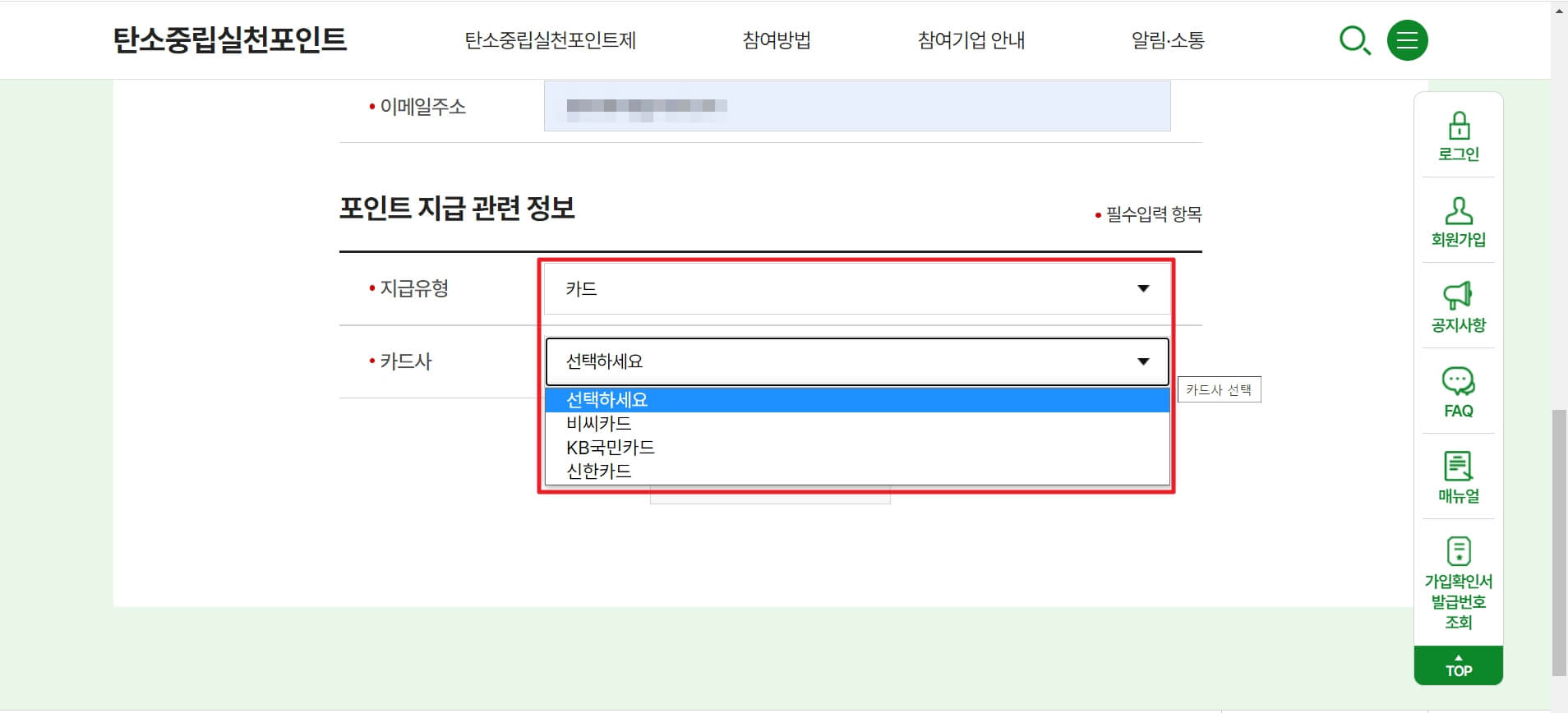 먼저 탄소중립실천포인트 홈페이지에 가입해보겠습니다. 가입 절차 중 유의사항으로는 가입 절차 중간에 인센티브를 지급받을 곳을 계좌나 카드로 선택하는 것입니다.