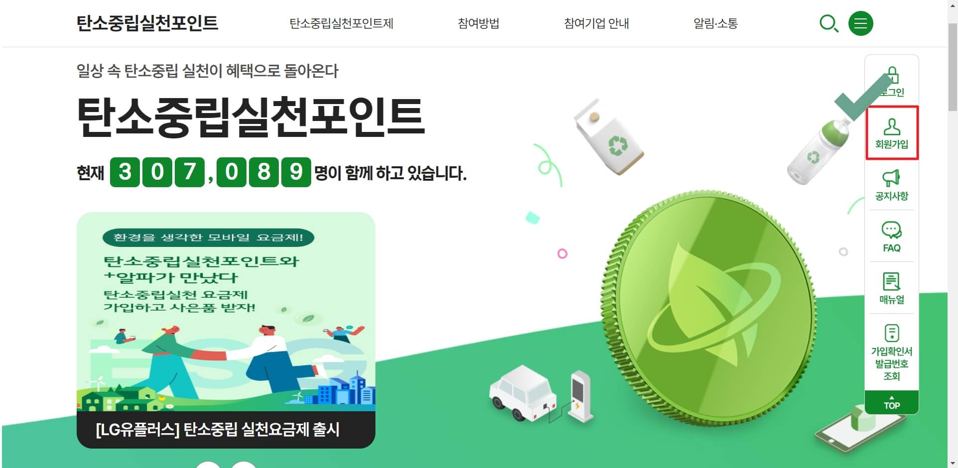 일상 속 탄소중립 실천이 혜택으로 돌아온다 탄소중립실천포인트 현재 308007명이 함께 하고 있습니다.