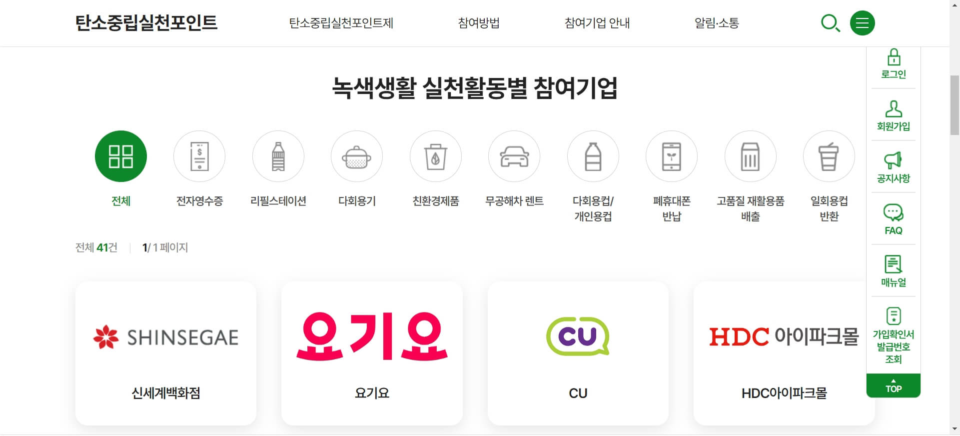 탄소중립실천포인트 홈페이지 내 상단메뉴에서 [참여기업 안내]를 보시면 활동별로 기업들이 소개되어 있으니 참고하시기 바랍니다.