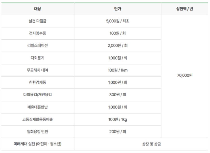 아래와 같이 최초 회원 가입만으로 실천 다짐금 5천원을 지급해 주며, 흔히들 많이 이용하는 전자영수증만 발급받더라도 1회당 100원을 인센티브로 지원받을 수 있습니다.
