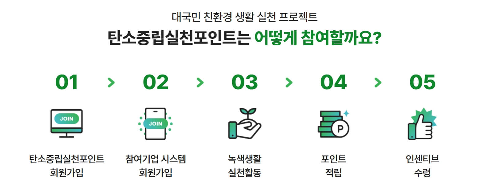 일반국민이 생활 속에서 탄소중립을 실천할 수 있는 문화를 확산시키기 위해 기획된 제도로써 우리들이 다양한 민간기업의 친환경활동을 이용 할 때 이용실적에 따라 인센티브를 지원하는 제도입니다.